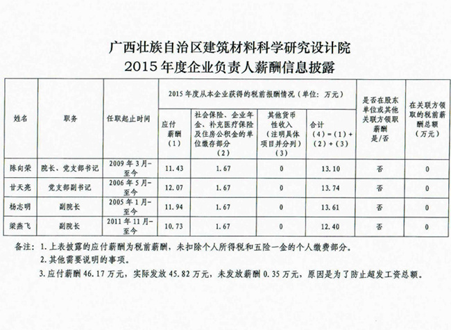 廣西壯族自治區(qū)建筑材料科學(xué)研究設(shè)計(jì)院2015年度企業(yè)負(fù)責(zé)人薪酬信息披露