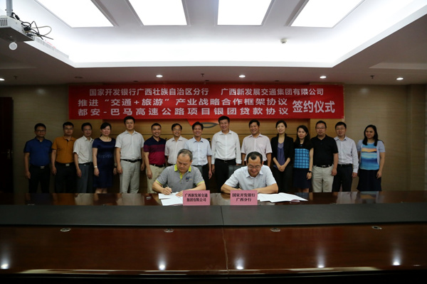 6月9日,集團公司與國家開發(fā)銀行廣西分行在南寧簽訂戰(zhàn)略合作框架協(xié)議。集團公司黨委書記、董事長朱堅和,黨委副書記、副董事長、總經(jīng)理唐咸秋,黨委委員、總會計師鄧遠志,國家開發(fā)銀行廣西分行黨委書記、行長謝志軍,副行長呂軍等領(lǐng)導(dǎo)出席簽約儀式。簽約前,雙方進行了友好會談,雙方重點圍繞賀州至巴馬高速公路、融水至河池高速公路、國省干線公路及沿線地區(qū)的“交通+旅游”項目開展深度戰(zhàn)略合作等方面進行了深入的交流與探討,并達成了一致共識。座談會后,唐咸秋與呂軍分別代表雙方簽訂戰(zhàn)略合作框架協(xié)議。雙方有關(guān)部門負責(zé)人參加簽約儀式。(集團公司 投資改革發(fā)展部)