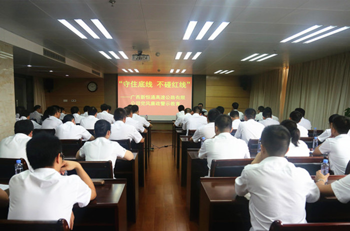 活動(dòng)上,新恒通公司黨委書記、董事長(zhǎng)賴水平還對(duì)與會(huì)人員進(jìn)行了廉政集體約談。賴水平感謝吳雄飛老師給大家上了一堂別開生面的廉政警示教育課,作為交通基礎(chǔ)設(shè)施建設(shè)行業(yè)的業(yè)主單位,在廉潔從業(yè)的道路上,他提出幾點(diǎn)要求和期望:一是加強(qiáng)學(xué)習(xí),提升道德修養(yǎng),堅(jiān)定理想信念;二是嚴(yán)于律己,規(guī)范作風(fēng)行為,筑牢防腐堤壩;三是嚴(yán)以用權(quán),增強(qiáng)廉政意識(shí),緊守從業(yè)底線;四是守土有責(zé),堅(jiān)持“一崗雙責(zé)”,深化責(zé)任落實(shí)。賴水平強(qiáng)調(diào),廣西交通基礎(chǔ)設(shè)施建設(shè)正處于大有可為、大有作為的歷史機(jī)遇期,面對(duì)紛繁復(fù)雜的形勢(shì),全體黨員干部要在黨的十九大精神的指引下,緊緊圍繞公司總體工作思路和目標(biāo),統(tǒng)一思想,堅(jiān)定信念,持續(xù)加強(qiáng)作風(fēng)建設(shè),堅(jiān)決把紀(jì)律挺在前面,耳邊常響廉潔警鐘,心中常筑反腐防線,用廉潔從業(yè)的實(shí)際行動(dòng)為公司“縣縣通”高速公路建設(shè)事業(yè)的發(fā)展保駕護(hù)航。